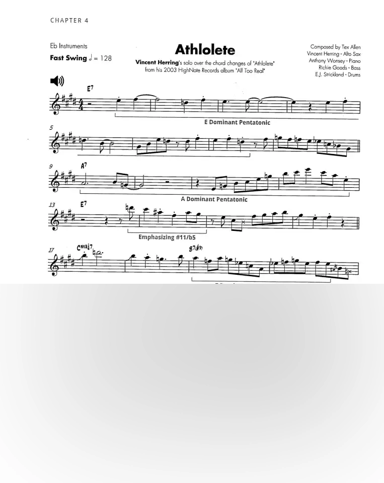 Mistrz saksofonu Vincent Herring stworzył unikalny i logiczny sposób podejścia do improwizacji — taki, który zapewni Twojemu rozwojowi muzycznemu solidne podstawy, których nie znajdziesz nigdzie indziej! Zawiera szczegółowe wyjaśnienia kluczowych pojęć związanych z improwizacją, a następnie ilustruje je transkrypcjami nagranych fraz, a także kompletnymi solówkami (w tym wersjami w tonacji C, Bb, Eb i kluczu basowym), pokazując, jak te pojęcia są wykorzystywane w rzeczywistych sytuacjach muzycznych. Zawiera: Dogłębne spojrzenie na pentatonikę. Analiza skali zmniejszonej. Formułowanie języka bebopu – nowe i bardziej skuteczne podejście. Kompleksowy zbiór idiomatycznych komórek, linii i wzorów dla wszystkich rodzajów akordów. Ponad 100 transkrybowanych fraz autorstwa Vincenta i innych mistrzów muzyki, ilustrujących różne koncepcje zawarte w książce. Filmy przedstawiające Vincenta grającego pomysły z książki, wraz z 7 filmami z transkrypcjami solówek Vincenta. Dla muzyków na każdym poziomie zaawansowania, grających na dowolnym instrumencie.