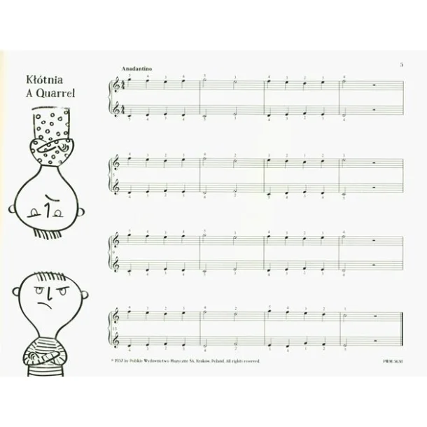 Cykl 26 krótkich miniatur to doskonały zbiór dla najmłodszych pianistów, rozpoczynających swoją muzyczną przygodę. Utwory zostały uporządkowane według stopnia trudności, co pozwala na systematyczne rozwijanie umiejętności gry na fortepianie. Każda miniatura cechuje się ilustracyjnością motywów, które pobudzają wyobraźnię dziecka, ułatwiają zapamiętywanie oraz czynią naukę bardziej angażującą i przyjemną. Takie utwory jak Kłótnia, Życzenie, Taniec Cygańskiczy Na huśtawce zachęcają do regularnych ćwiczeń, wprowadzając w świat muzyki z radością i inspiracją. Zbiór jest również wzbogacony o nagrania wszystkich kompozycji, co pomaga w interpretacji i wspiera proces nauki.