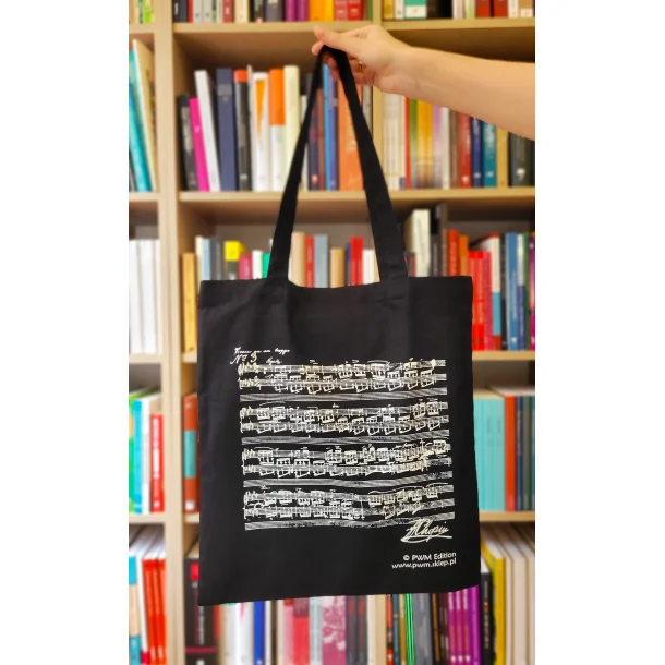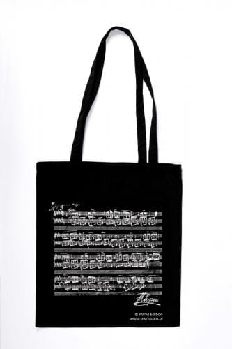 Czarna torba płócienna z długimi uszami, z nadrukiem białych nut Chopina. Klasyczna i elegancka, będzie jednocześnie praktycznym dodatkiem na co dzień.
